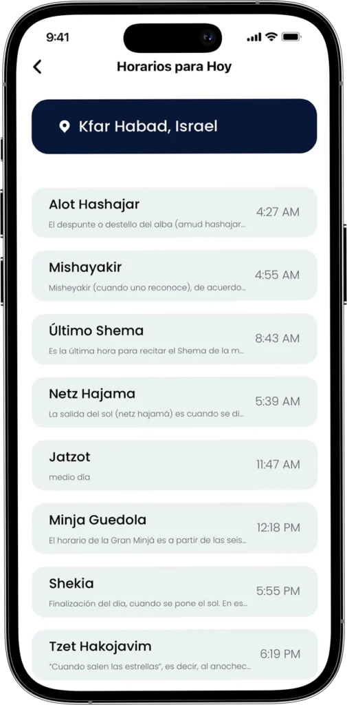 Accedé a un Sidur online dinámico que se ajusta automáticamente a tu ubicación. Consultá los horarios diarios de las tefilot de forma precisa y organizada, sin necesidad de usar otras apps o buscar en sitios externos.